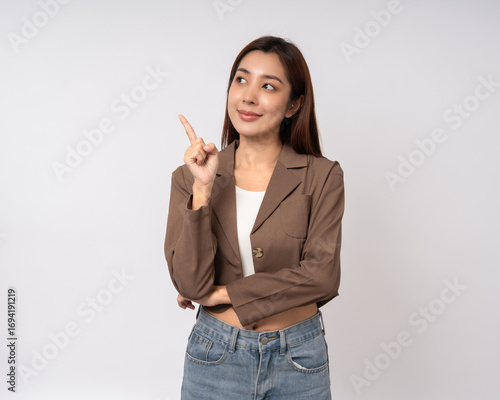 Beautiful smiling happy young asian woman in jacket suit pointing to blank space holding something. Charming female lady standing pose hand palm up. Asian woman people thinking with copy space