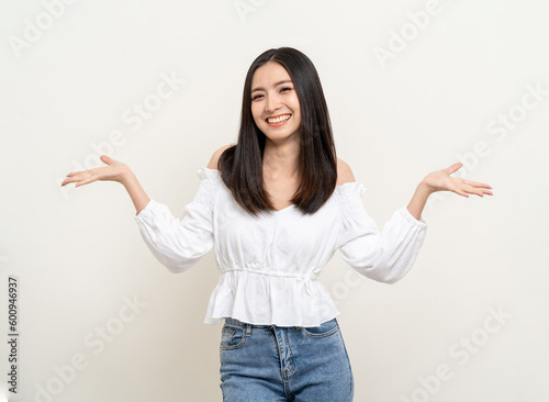 Beautiful smiling happy young asian woman in white shirt. Charming female lady open hands palm up holding something on isolated white background. Asian cute Pretty people looking copy space.