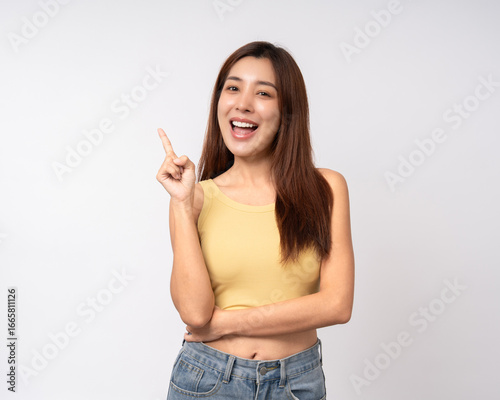 Beautiful smiling happy young asian woman in yellow shirt pointing to blank space holding something. Charming female lady standing pose hand palm up. Asian woman people looking camera confident