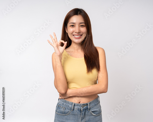 Beautiful smiling happy young asian woman in yellow shirt showing ok sign. Charming female lady standing pose on isolated white background. Asian woman people looking camera confident