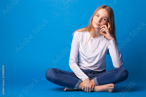 Beautiful smiling teen girl in jeans and a white blouse on blue background.