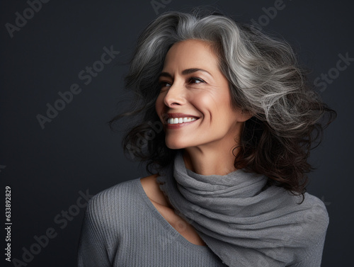 Beautiful smiling woman aged 50 model with natural makeup clean face beige warm background, isolated, anti aging care, natural beauty concept, cosmetology and wellness concept, png