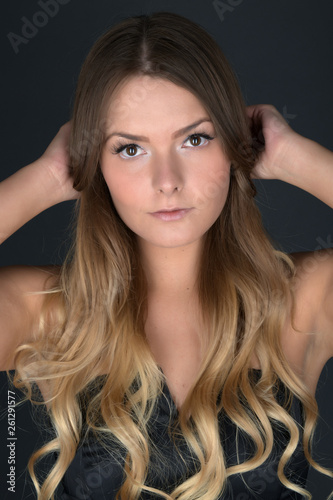 Beautiful smiling woman with clean skin, natural make-up, and white teeth on grey background