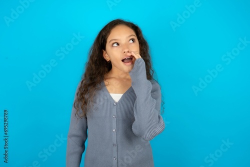 Beautiful teen gil wearing casaul clothes over blue background hear incredible private news impressed scream share