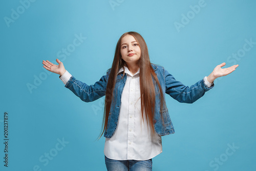 Beautiful teen girl looking suprised and bewildered isolated on pink
