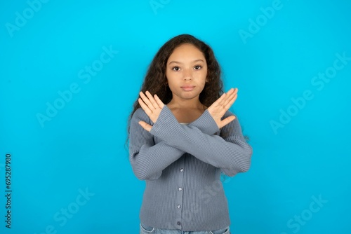 Beautiful teen girl wearing blue jacket over blue background has rejection expression crossing arms and palms doing negative sign, angry face.