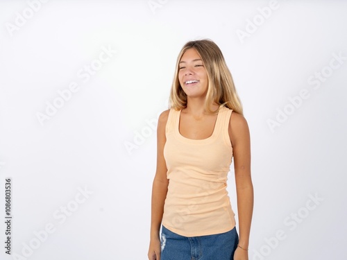 Beautiful teen girl wearing sleeveless t-shirt very happy and excited about new plans.