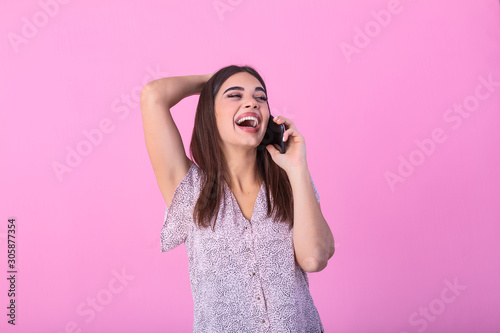 Beautiful teen woman talking on cellphone, making happy surprice face, studio shot. Portrait of a pretty joyful girl in dress talking on mobile phone