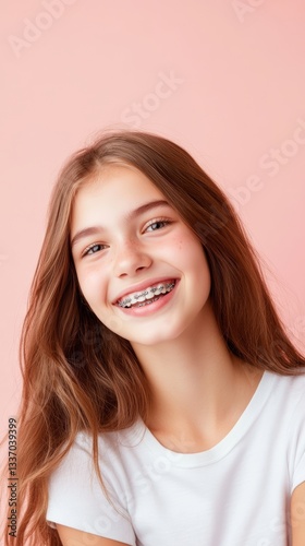 Beautiful teenage girl with braces smiling confidently in a close-up half-face portrait on peach background.