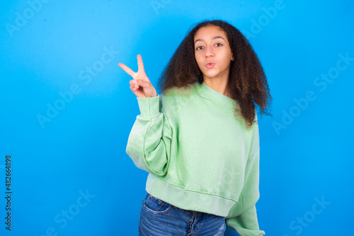 beautiful teenager girl wearing green sweater standing against blue background makes peace gesture keeps lips folded shows v sign. Body language concept
