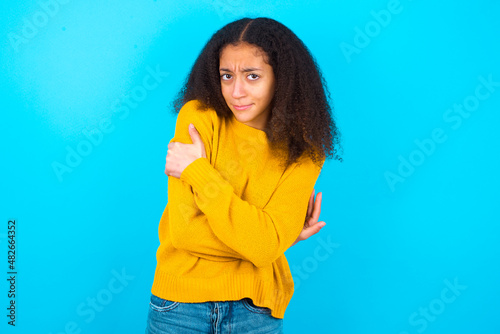 beautiful teenager girl wearing yellow sweater standing against blue background shaking and freezing for winter cold with sad and shock expression on face.