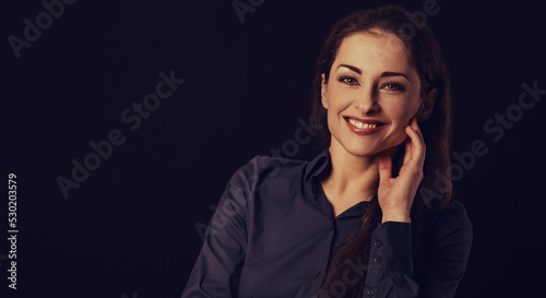 Beautiful thinking toothy smiling business woman with folded arms in blue shirt on black background with empty copy space for text. Closeup