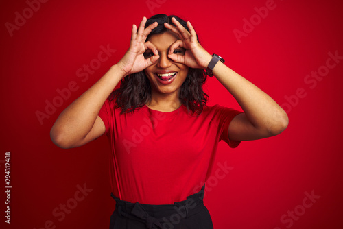 Beautiful transsexual transgender woman wearing t-shirt over isolated red background doing ok gesture like binoculars sticking tongue out, eyes looking through fingers. Crazy expression.
