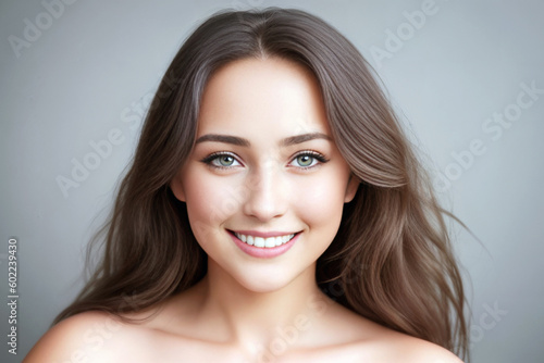 Beautiful woman brunette beauty close-up portrait on gray background. Generative AI