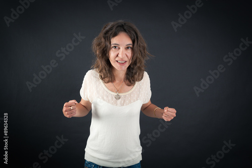 Beautiful woman doing different expressions in different sets of clothes: angry