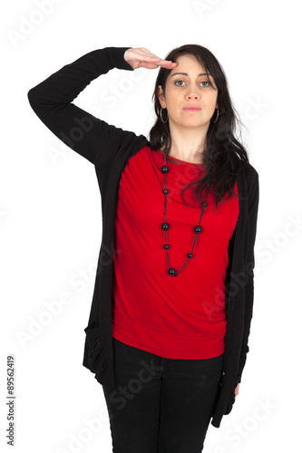 Beautiful woman doing different expressions in different sets of clothes: at attention
