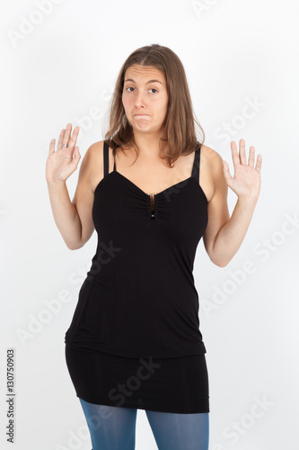 Beautiful woman doing different expressions in different sets of clothes: innocent
