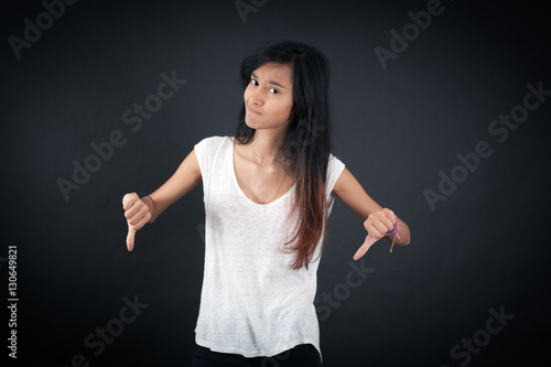 Beautiful woman doing different expressions in different sets of clothes: thumbs down