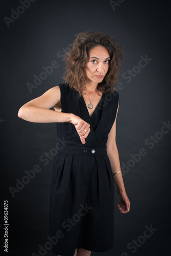 Beautiful woman doing different expressions in different sets of clothes: thumbs down