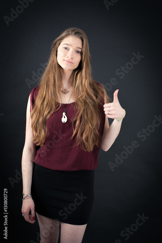 Beautiful woman doing different expressions in different sets of clothes: thumbs up