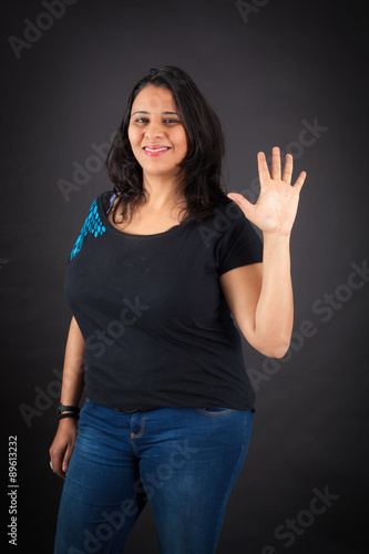 Beautiful woman doing different expressions in different sets of clothes: waving
