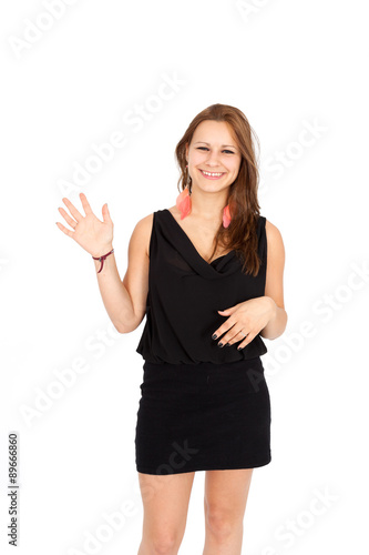 Beautiful woman doing different expressions in different sets of clothes: waving