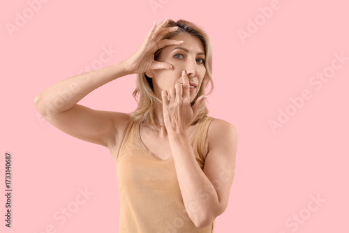 Beautiful woman doing face building exercise on pink background