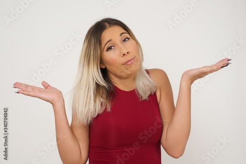 Beautiful woman doubt expression, confuse and wonder concept, uncertain future shrugging shoulders, standing against gray Wall.