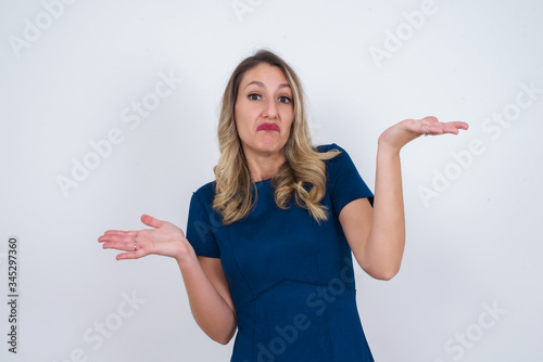 Beautiful woman doubt expression, confuse and wonder concept, uncertain future shrugging shoulders, standing against gray Wall.