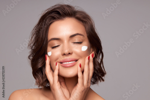 Beautiful Woman Face With Cream On Fresh Soft Skin. Cosmetics
