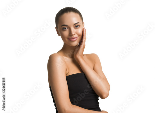 Beautiful woman hand touching skin manicure nails tanned skin natural make up clen fresh body care