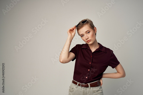 beautiful woman in a red shirt classic style isolated background