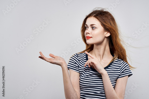 beautiful woman in a striped t-shirt red lips gesture with his hands model studio