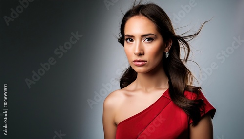 Beautiful woman in an red dress isolated on white background. She has a serious expression on her face