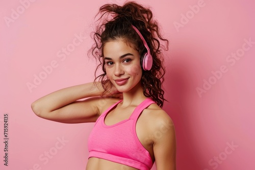beautiful woman in pink outfit and athletic shoes on a pink background