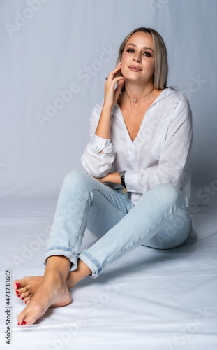 beautiful woman portrait in studio posing sitting on the floor. girl in a white shirt and blue jeans, smiling barefoot, model posing, poses, beautiful hands. Gray background