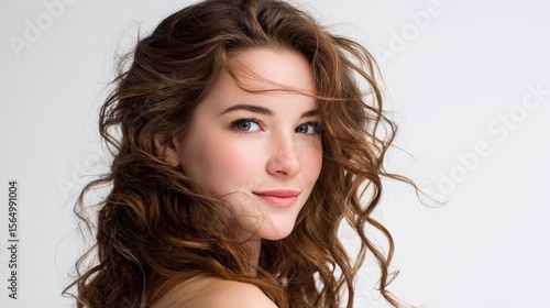 Beautiful woman portrait. Natural, healthy skin and curly hair. Ideal for beauty, fashion, and cosmetics advertising.