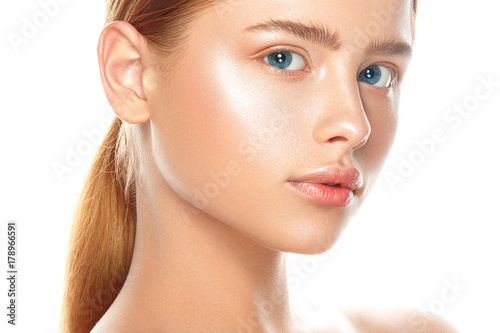 Beautiful woman portrait with fresh clear nude make up, healthy skin, skin care.