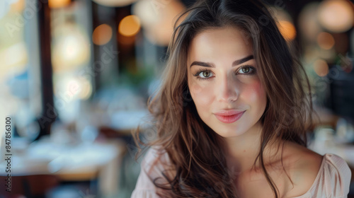 Beautiful woman sitting in restaurant looking at camera