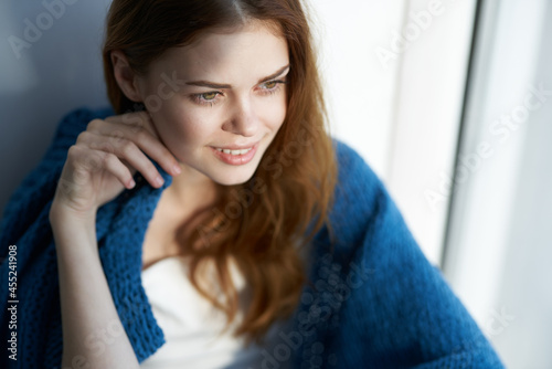 beautiful woman sitting near the window with a blue plaid
