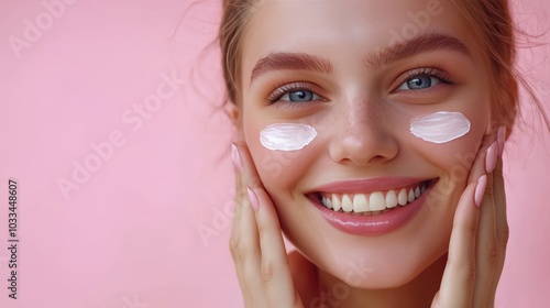 Beautiful woman smile use cream for good skin. face of a healthy woman apply cream and makeup. Advertisement for skin cream, anti-wrinkle, baby face, whitening, moisturizer, tighten pores.