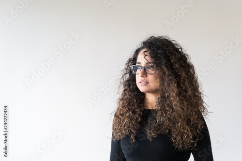 Beautiful woman smiling with curly hair dressed on black and wearing glasses watching through the window