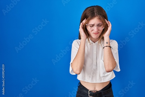 Beautiful woman standing over blue background with hand on head for pain in head because stress. suffering migraine.