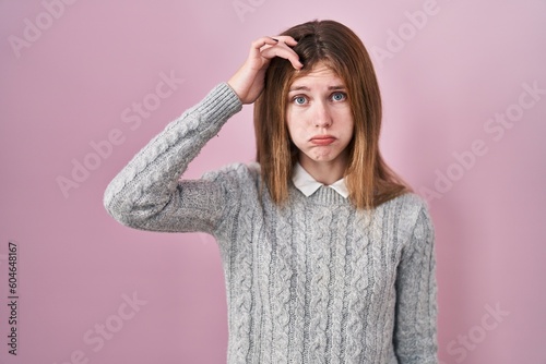 Beautiful woman standing over pink background worried and stressed about a problem with hand on forehead, nervous and anxious for crisis