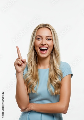 Beautiful woman standing straight pointing her hand up because she got an inspiring idea to solve life's problems
