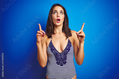 Beautiful woman wearing bikini swimwear over blue isolated background amazed and surprised looking up and pointing with fingers and raised arms.