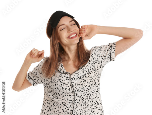 Beautiful woman wearing pajamas and sleep mask on white background. Bedtime