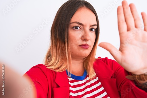 Beautiful woman wearing striped t-shirt and jacket standing over isolated white background with open hand doing stop sign with serious and confident expression, defense gesture
