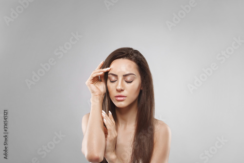 Beautiful woman with a French manicure nail , skin care concept, beautiful skin. Portrait of female hands with manicure nails. Сare for hands and nails and cosmetics. Copyspace