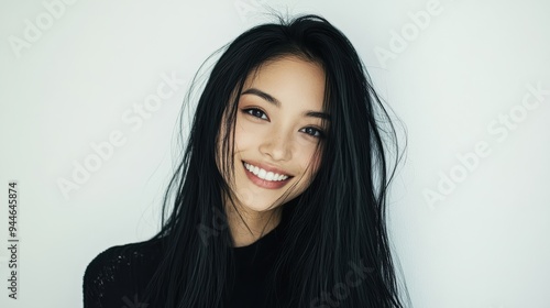 Beautiful woman with long black hair poses against a white wall backdrop, ideal for commercial use or banner ads. The clean background accentuates her striking features.